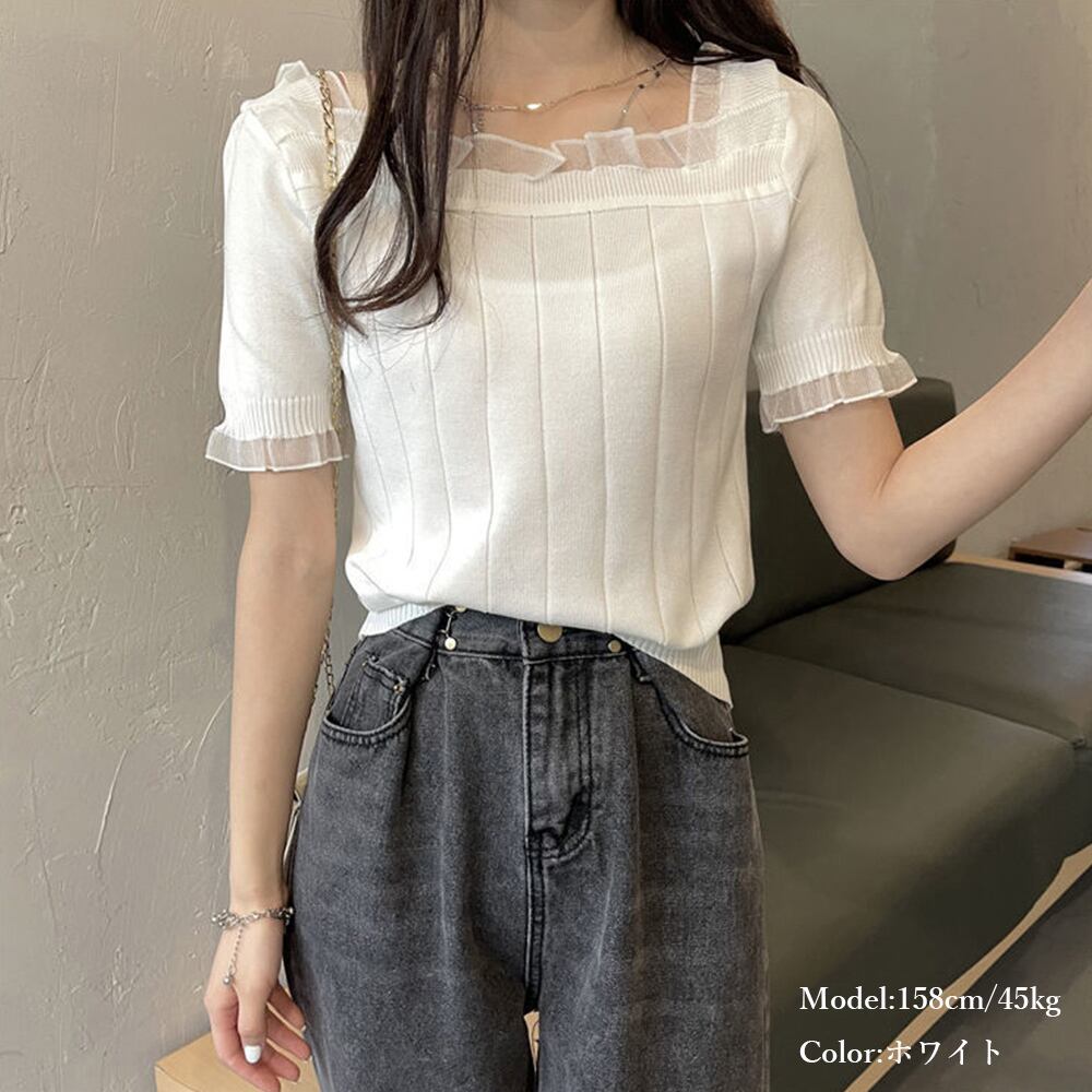 【日本倉庫即納】 スクエアネック サマーニット レース付き