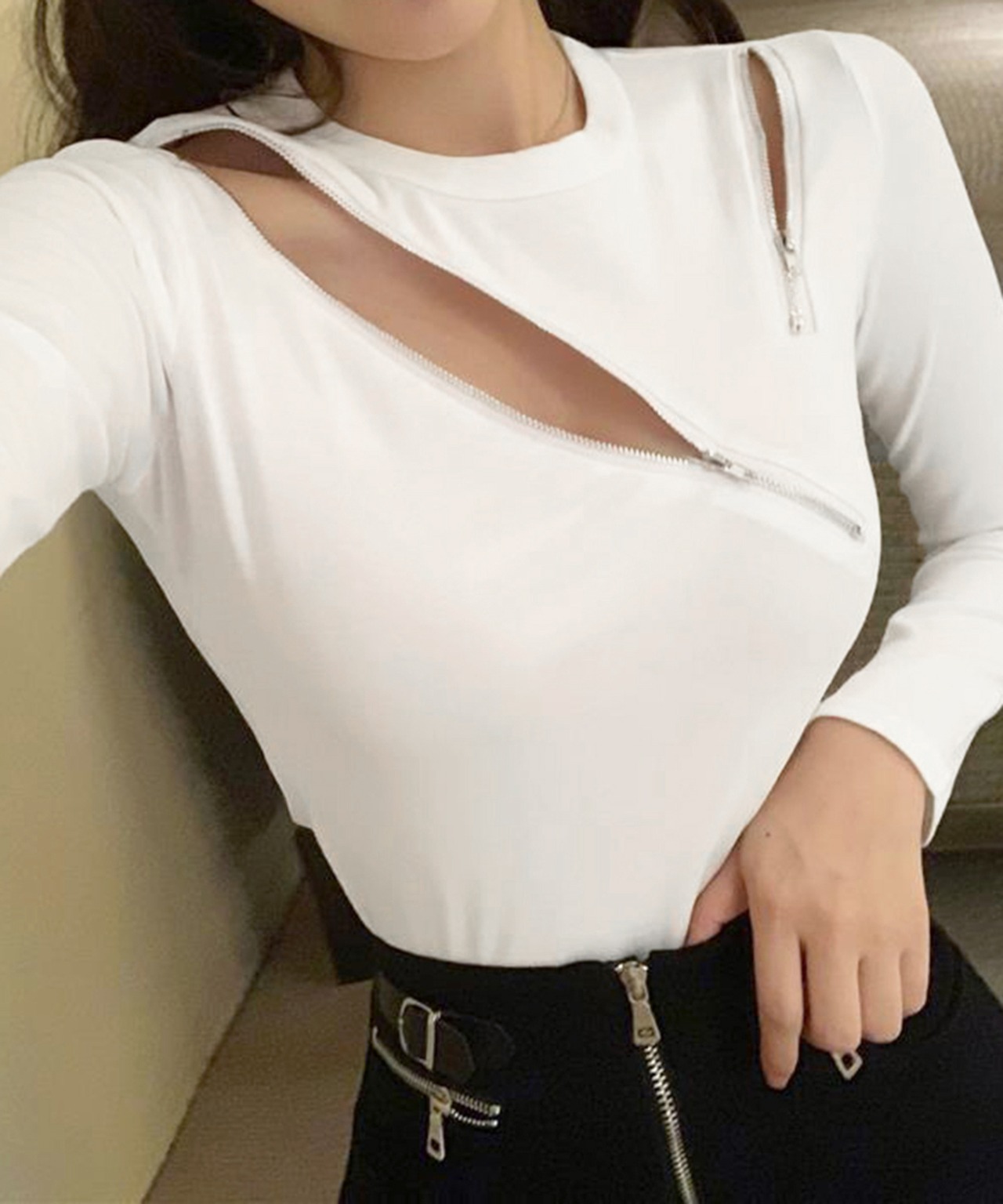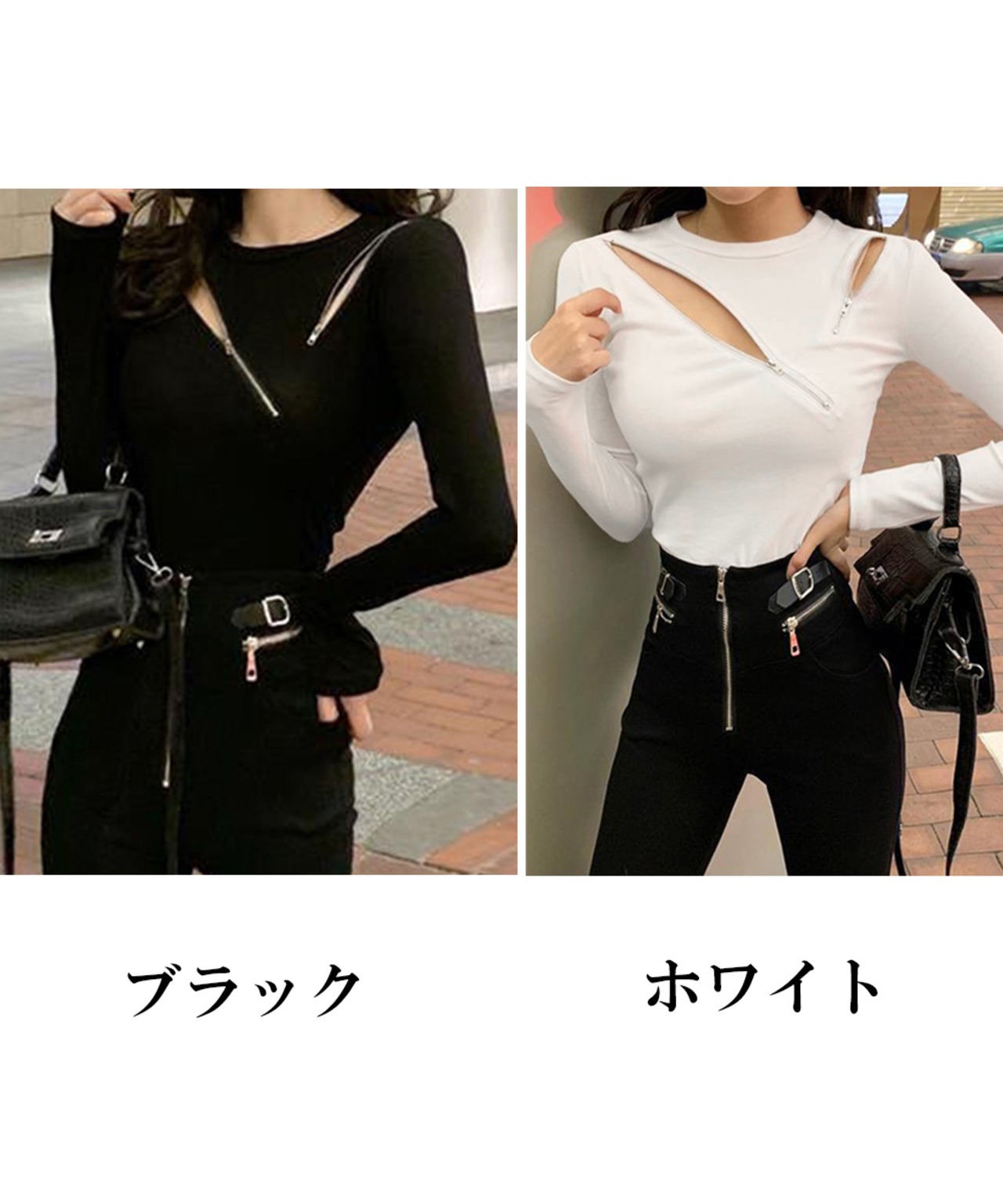 レディース アシンメトリーデザイン ジッパー付き セクシートップス 韓国風 トレンド ファッション カジュアルニットソー