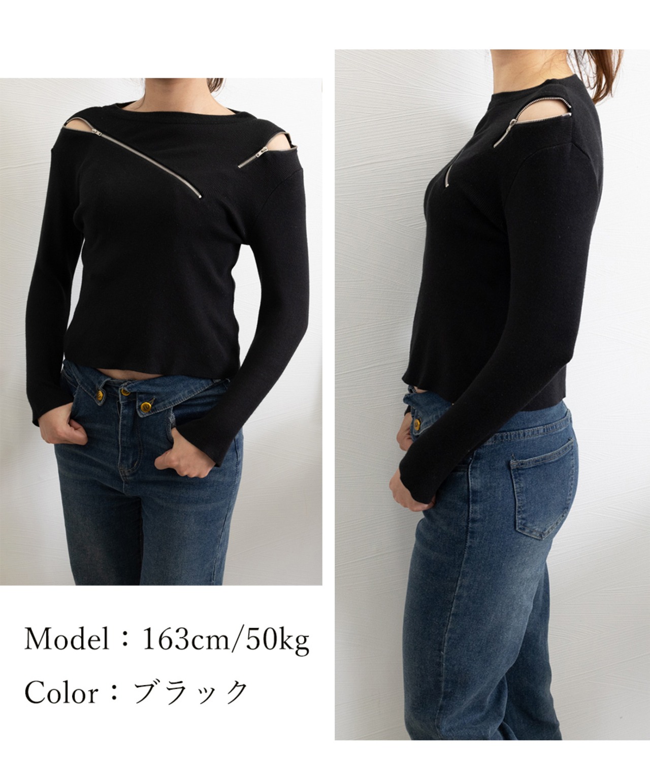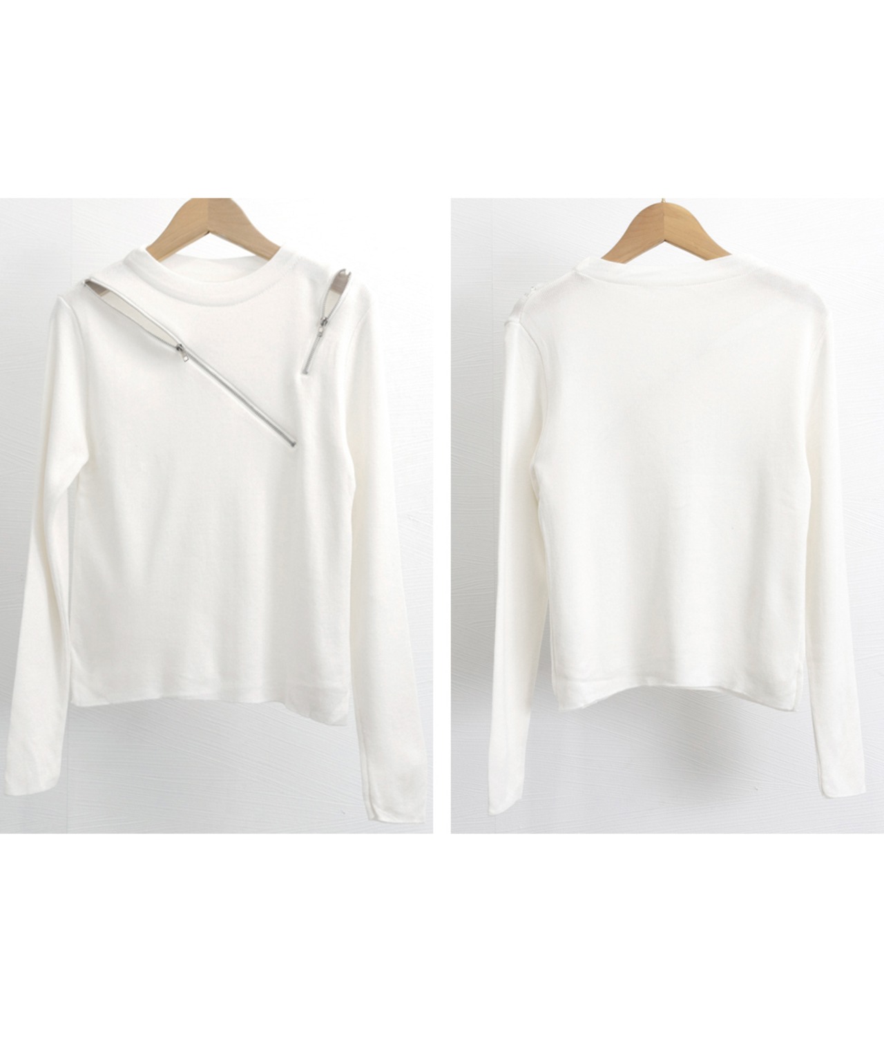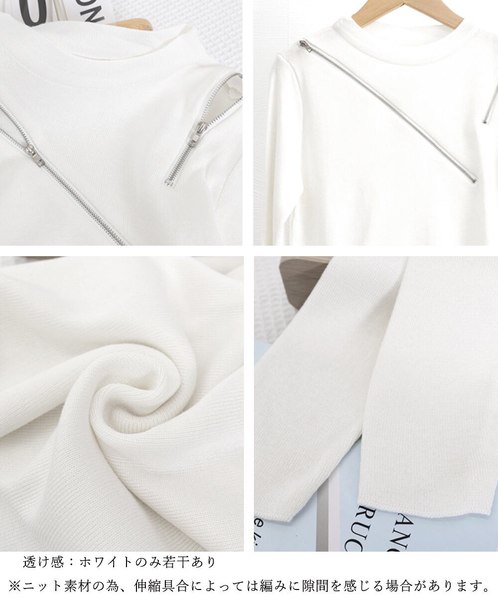 アシンメトリーなZIPデザインが目を引く、スタイリッシュなニットトップスです。