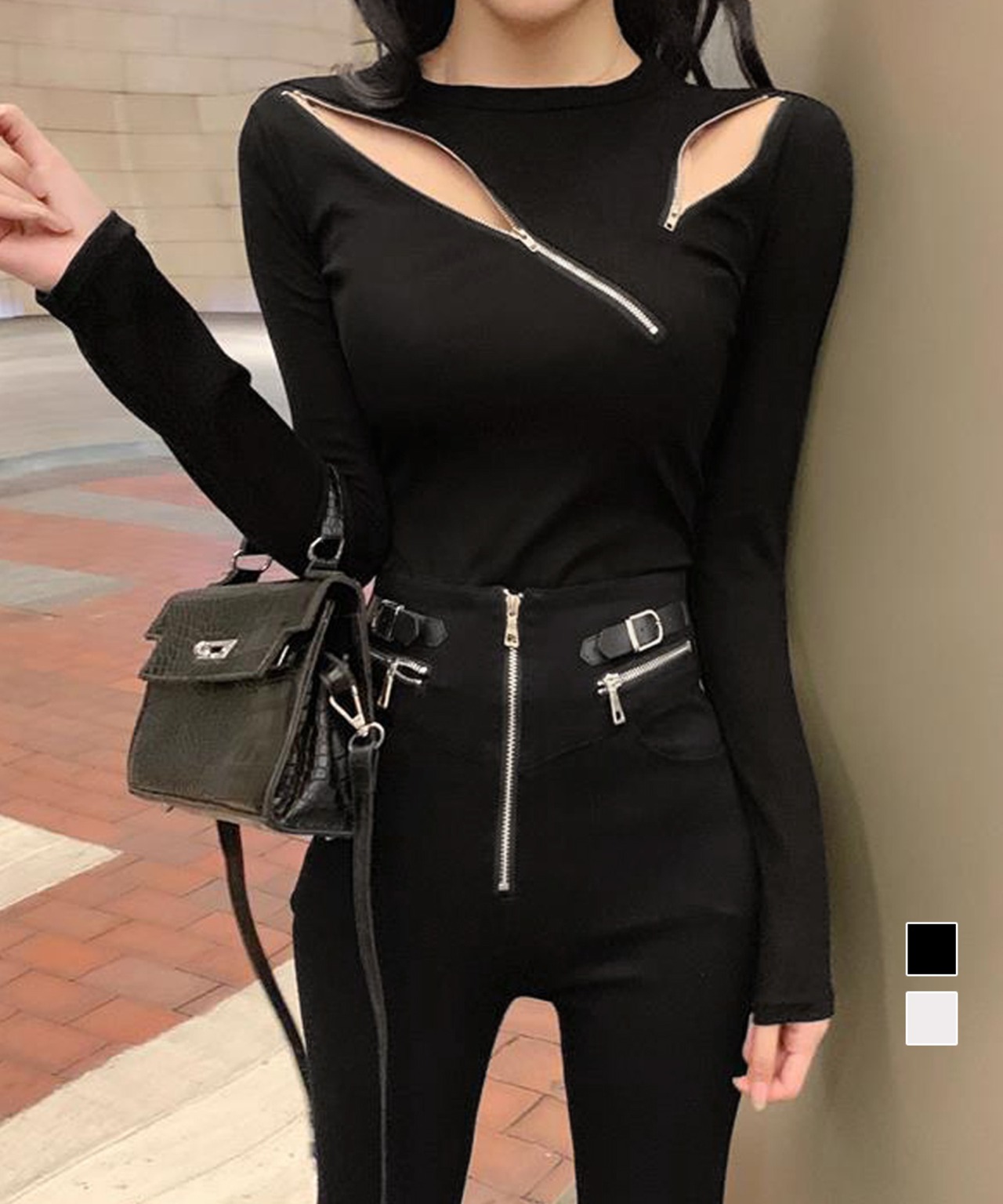 ジッパーの開閉位置を自由に調整でき、閉じればシンプルに、少し開ければセクシーな印象を演出します。