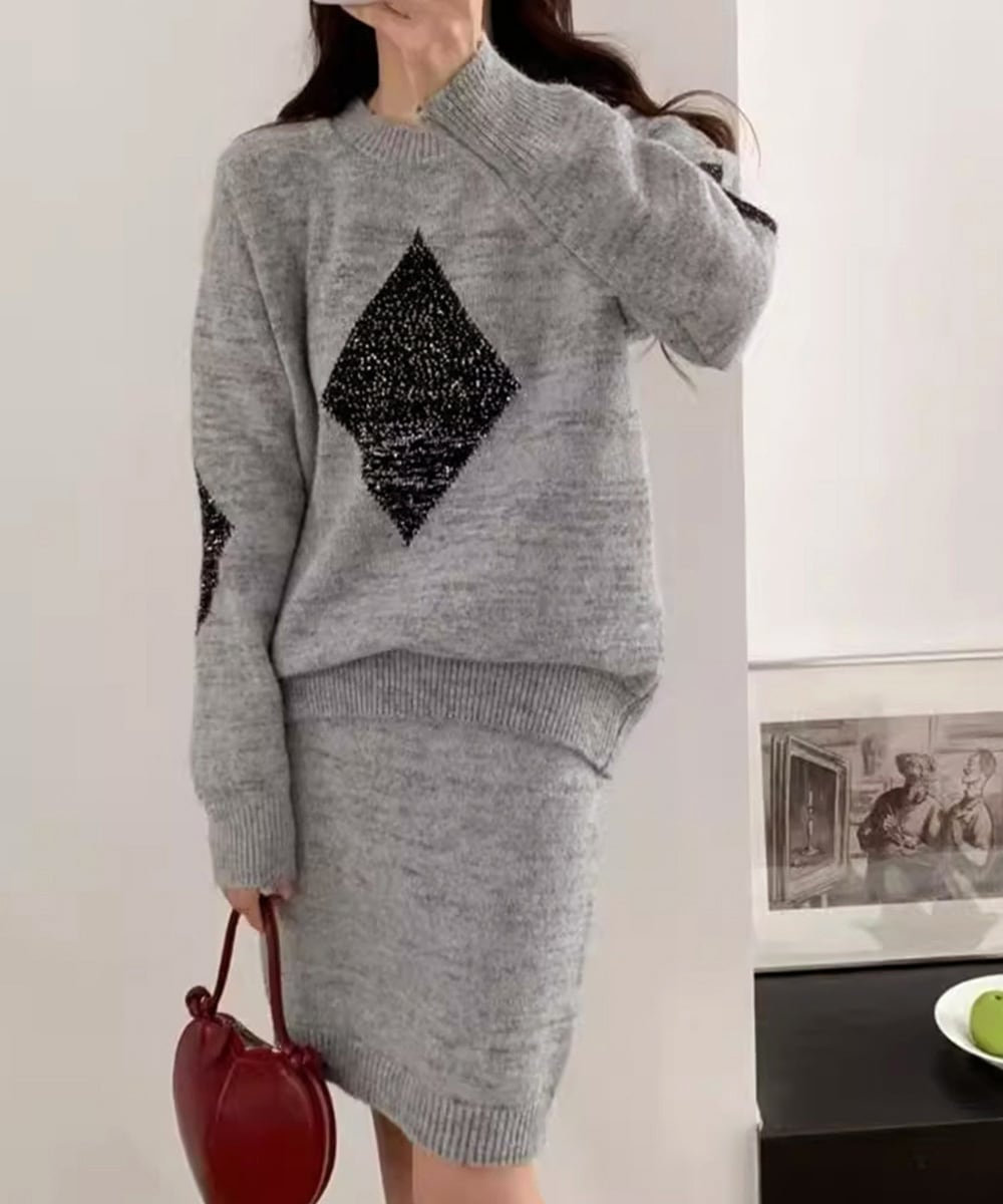 韓国風きらきらニット上下セット レディース 菱形モチーフニットトップス長袖 ニットミニスカート おしゃれ 秋冬ツーピース