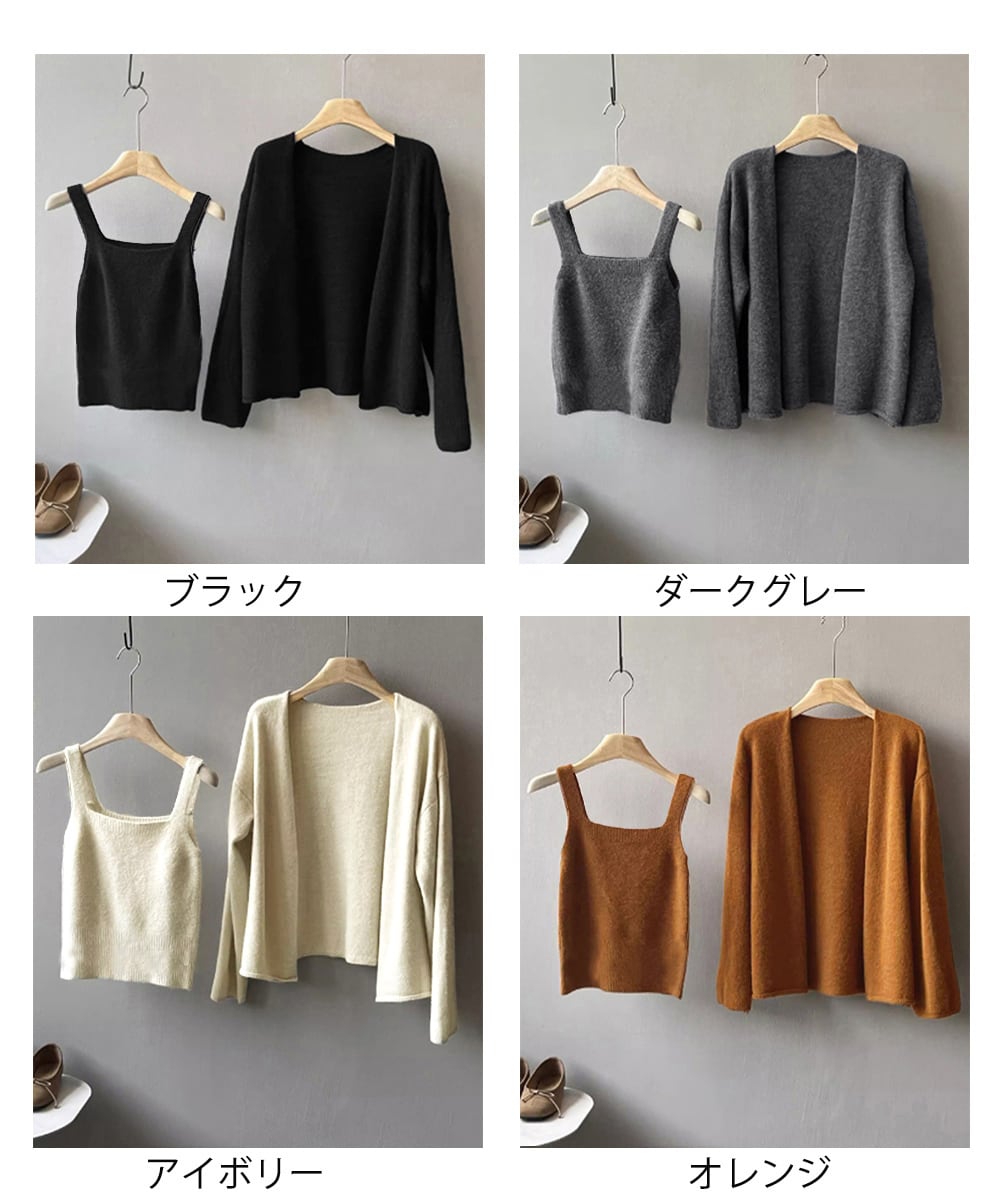 ベーシックなカーディガンとキャミソールの2点セットで、ひとつで重ね着コーデが完成。