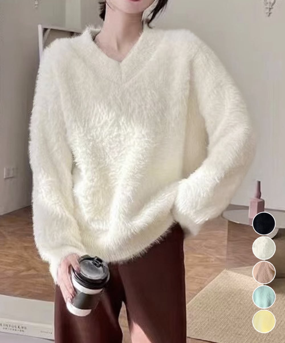 柔らかく毛足の長い上質な素材を使用したVネックニットトップス。