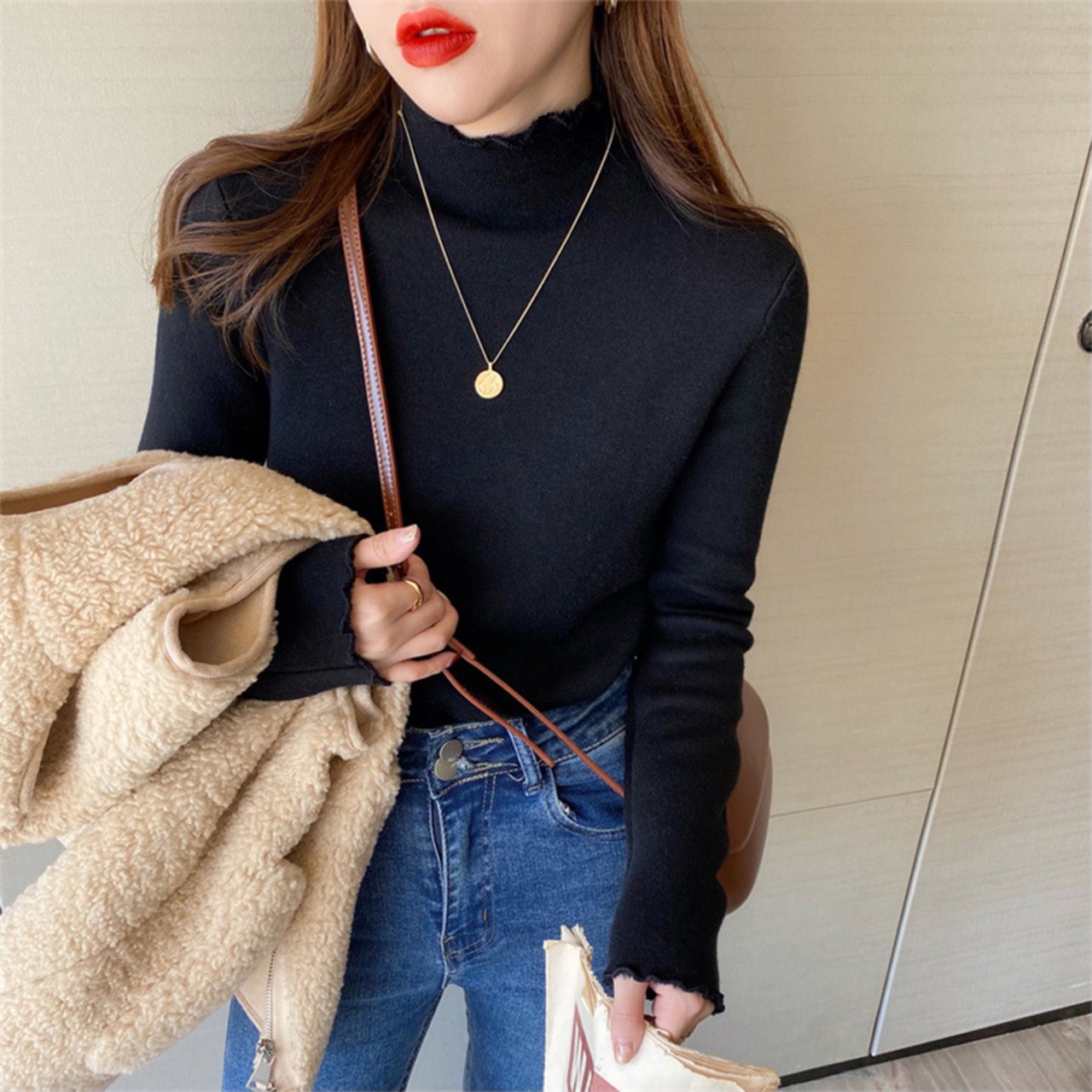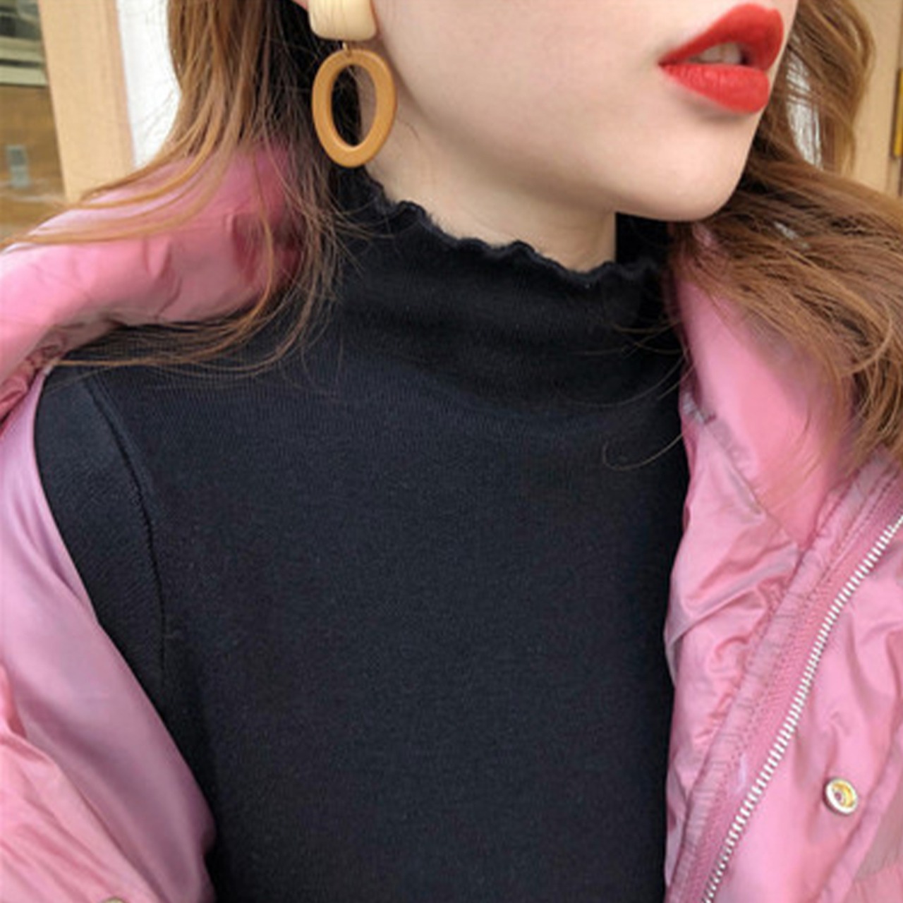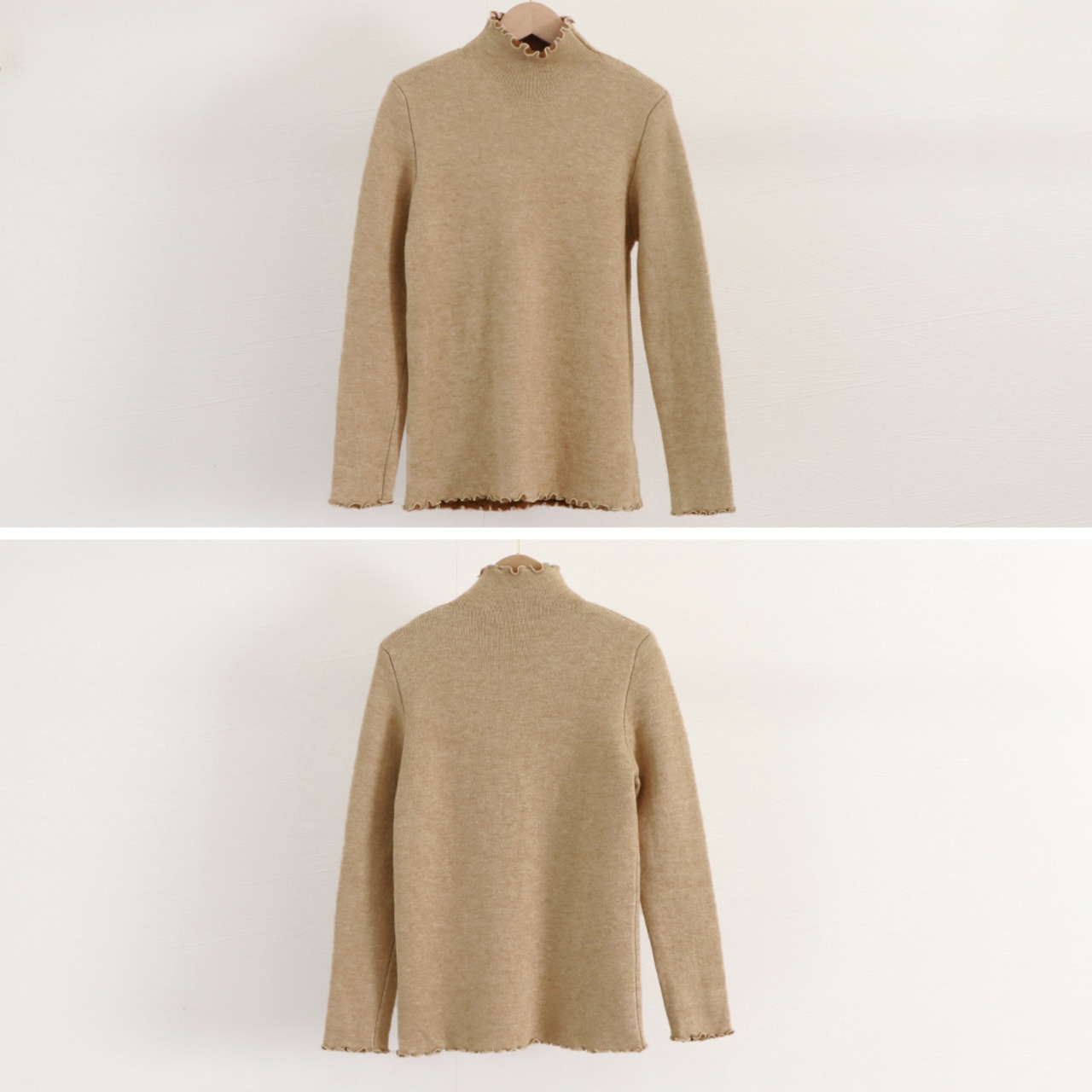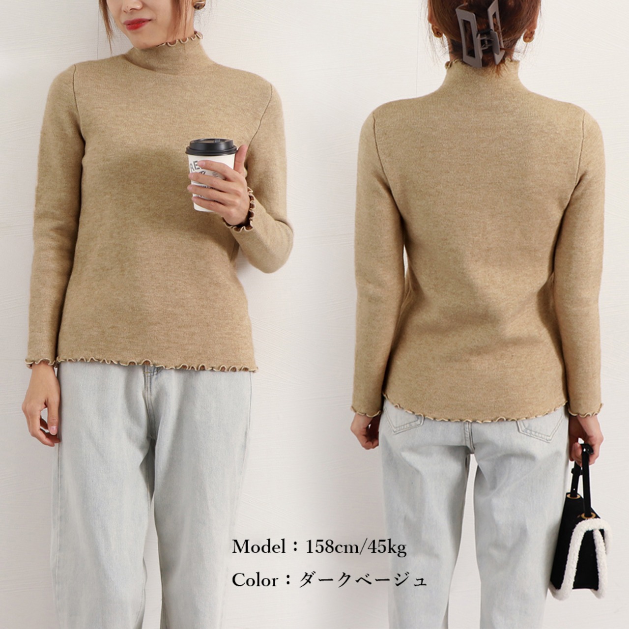 裏面はふんわり柔らかい肌当たりの起毛生地で、熱を逃がさず内側から温もりを与えてくれるハイネックニットトップス