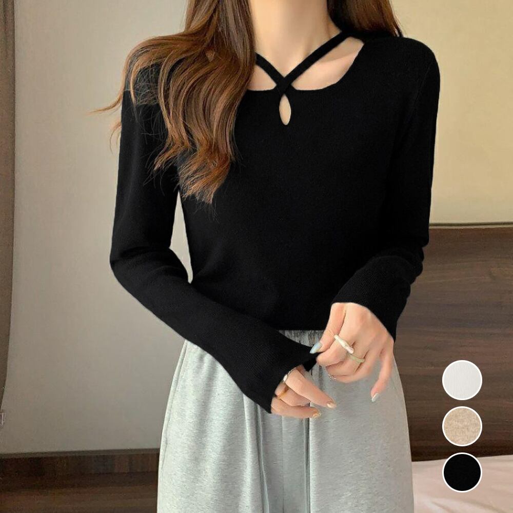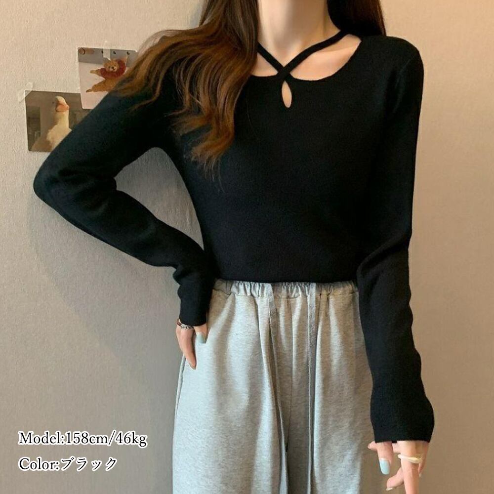 大人女性に合う上品なクロスネックデザインのリブニットトップス