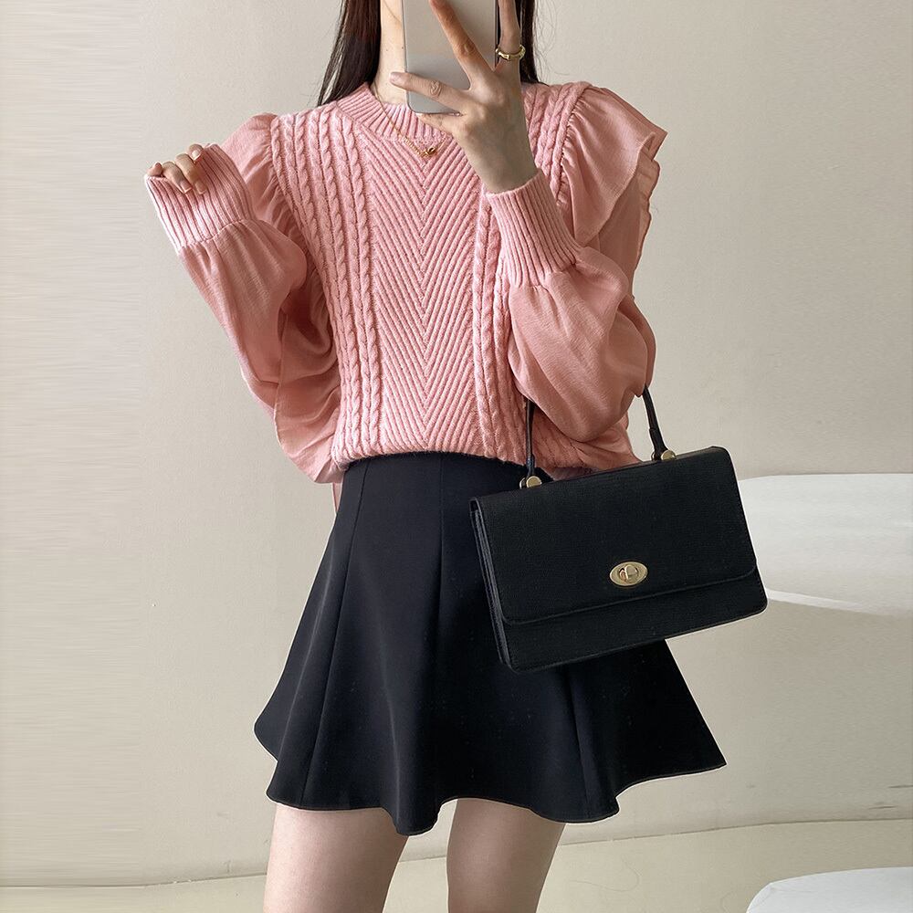 ランタンスリーブが旬のアクセントになる異素材mixのニットトップスです