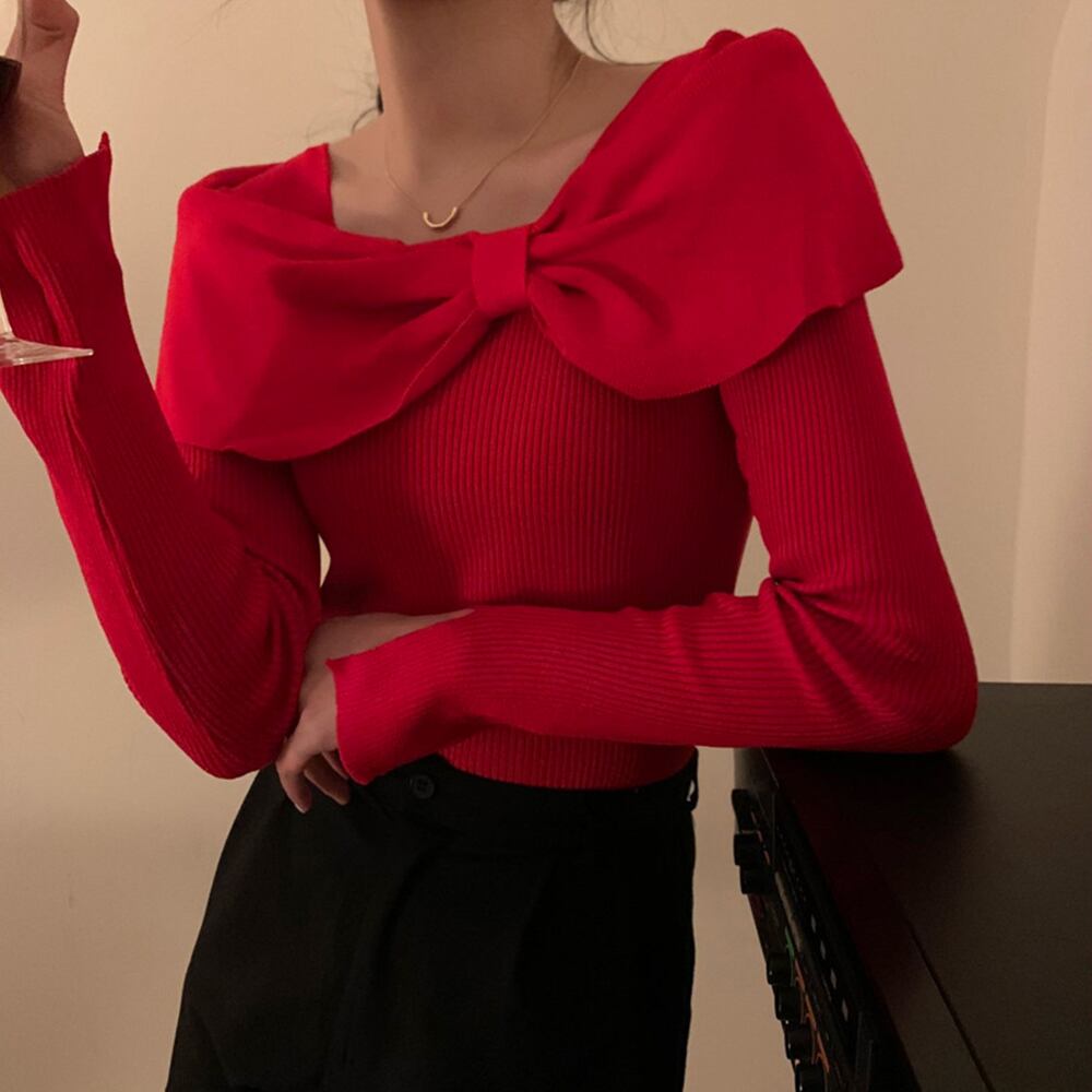 ボリューム感のあるビッグリボンが目を引くニットプルオーバー。