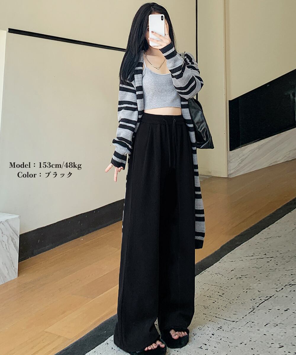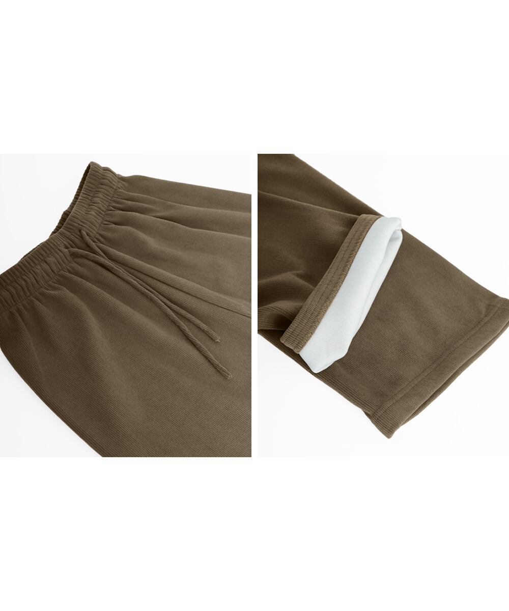 ウエストゴム仕様、また紐で調節できるのでお好みに合わせてストレスフリーなはき心地。そして、裏起毛。