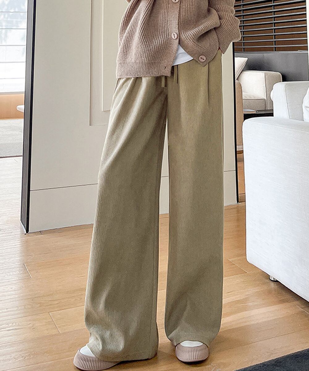 程良いワイドシルエットで、長いシーズンで着用できるシンプルなデザインのワイドパンツ。流行りのコーデュロイ。