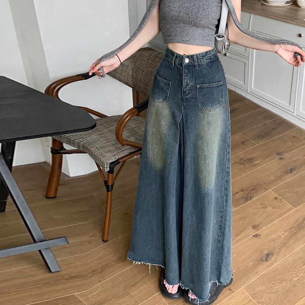 たっぷりなロング丈でリラックス感満載、ウォッシュユーズド加工でこなれ感を絶妙に表現する韓国っぽフレアジーパン*
