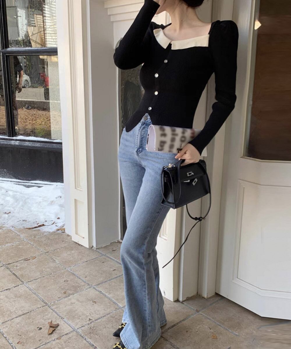 フロントのスリットがアクセントを効かせたリブニットトップス。