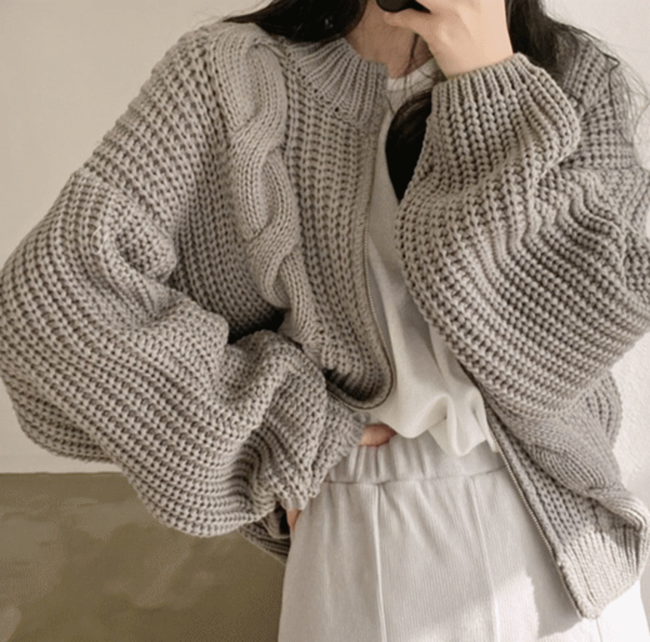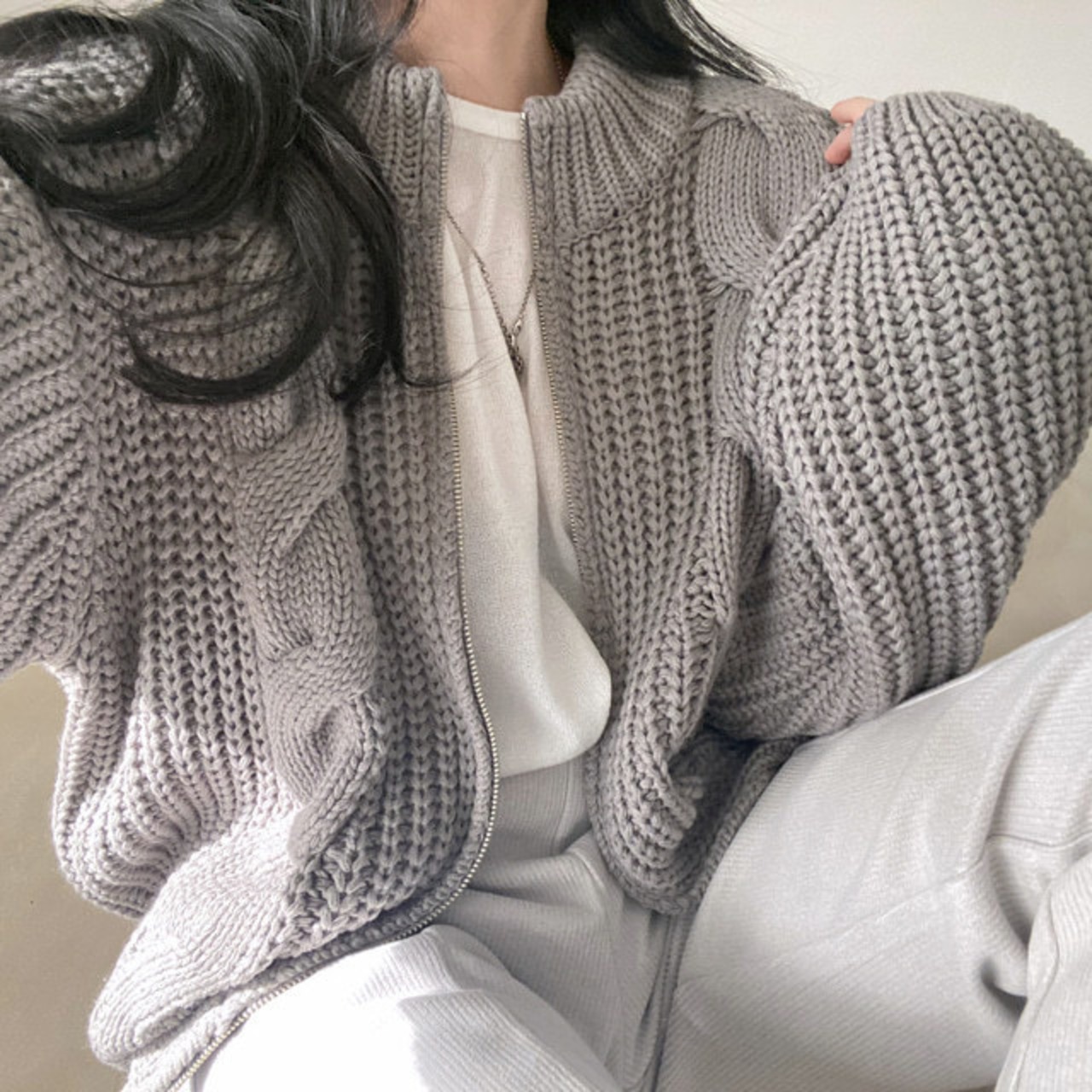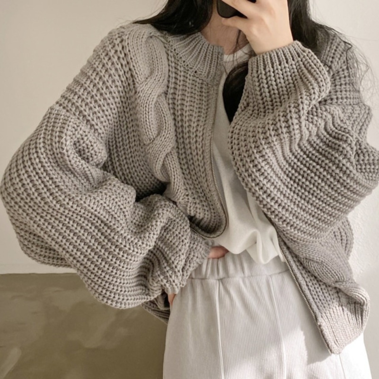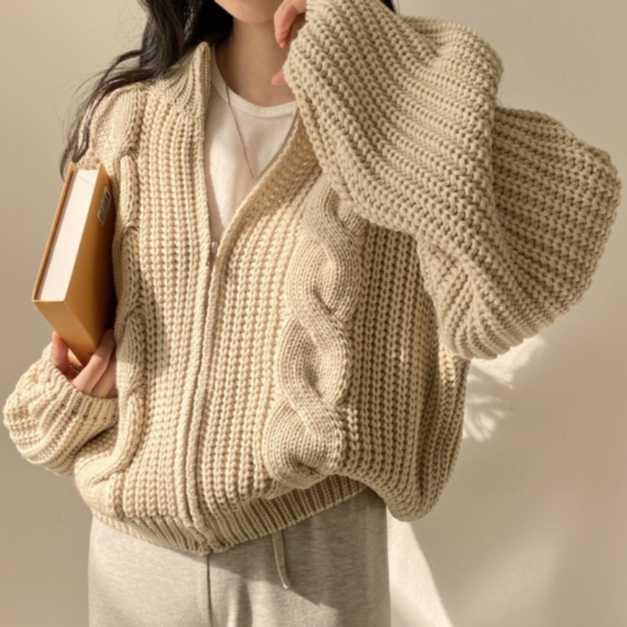韓国風 フロントファスナー ケーブル ニット カーディガン