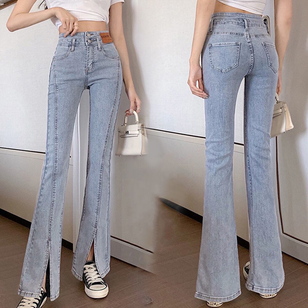 女性らしい曲線美を見せるフレアラインが魅力的なフロントスリットデニムパンツ