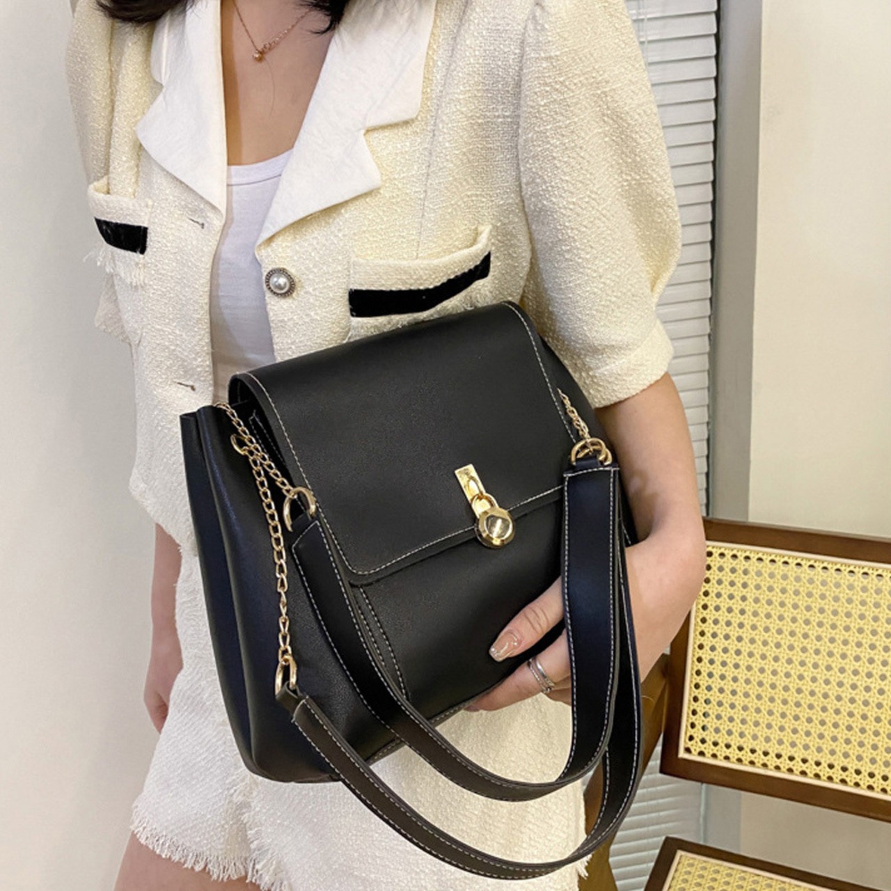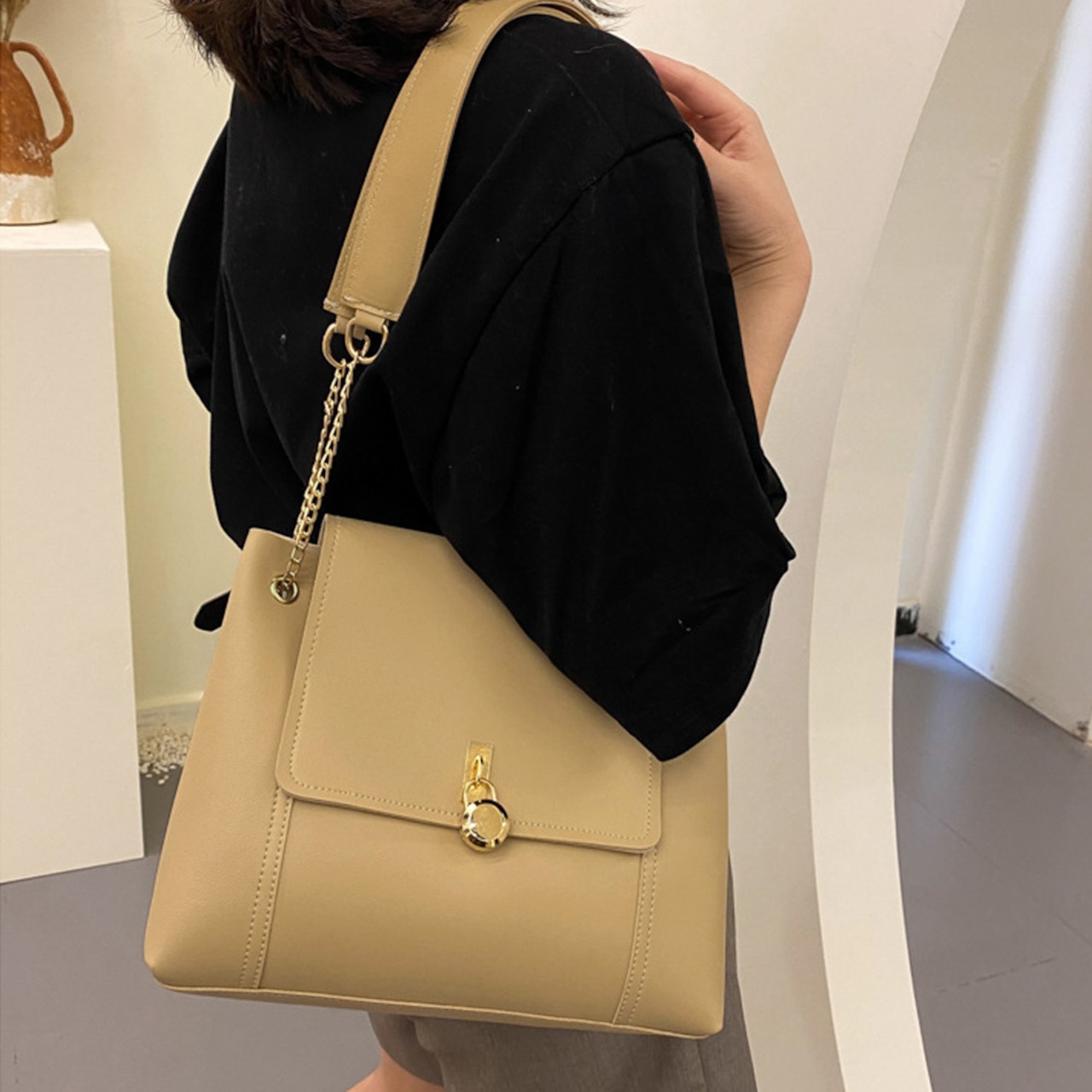 ゴールド色の丸型南京錠の金具がオトナガーリーなかぶせ式ショルダーバッグ。